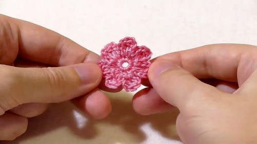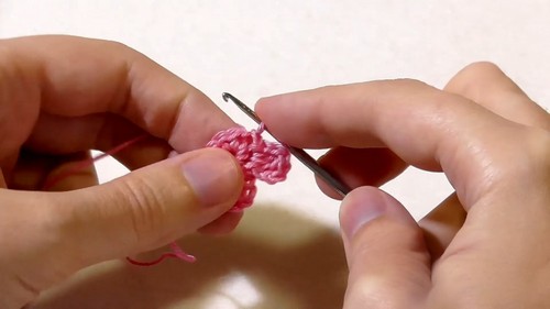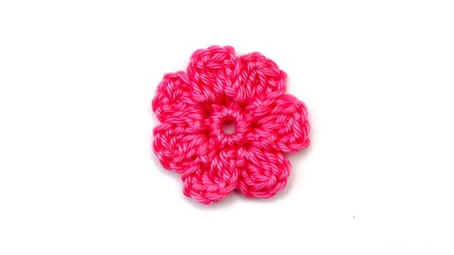 - Repeat steps 1–5 until you have 7 petals in total, one in each sc from previous round.