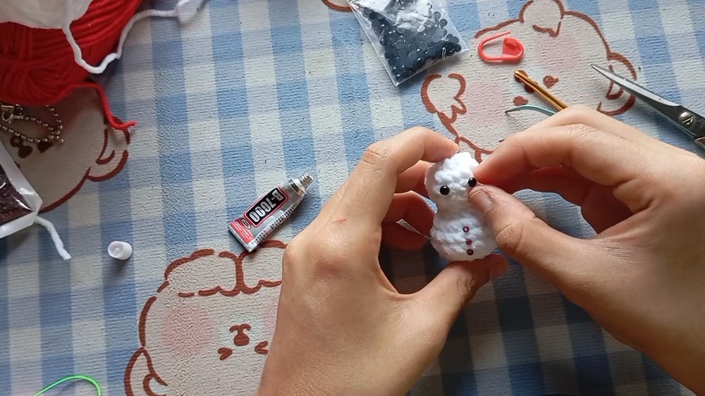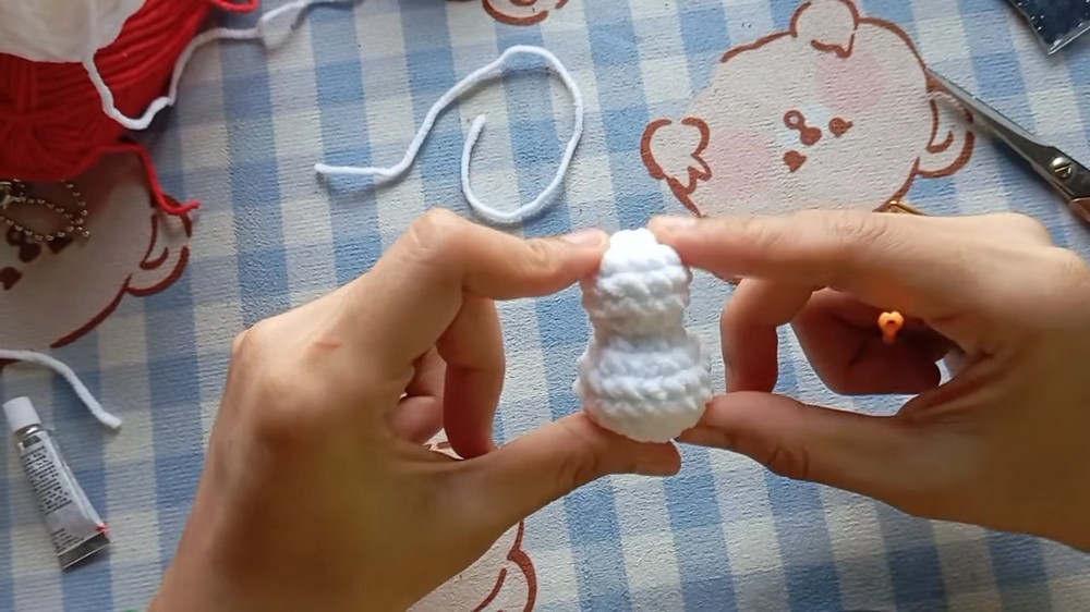 - Use the needle to hide the yarn tail inside the snowman.