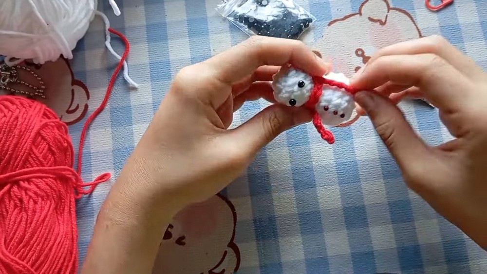 - Insert both yarn ends through to the back of the head, pull snug, and tie securely inside. Hide ends inside the body with the needle.