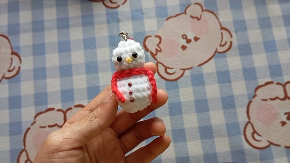 - Attach a key ring/loop through the top of the snowman’s head.