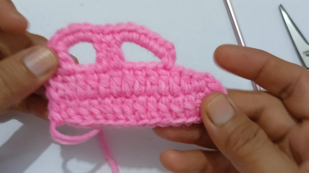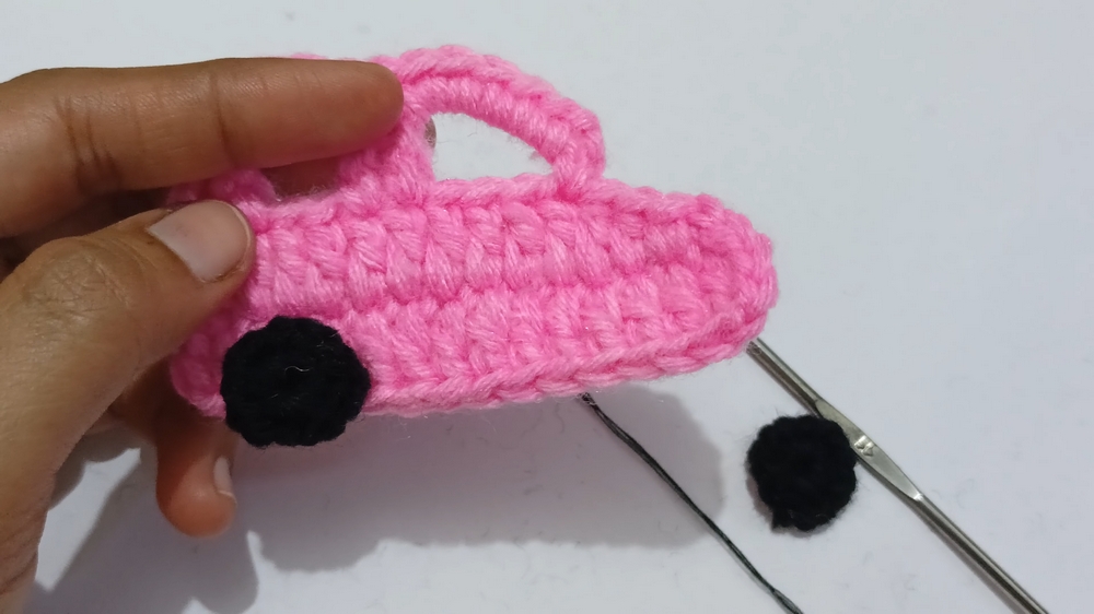 Once the main structure is completed, focus shifts to the tires. Tiny black circles, meticulously formed with a magical ring and single crochets, add a realistic touch, grounding the airy lightness of the car’s body.