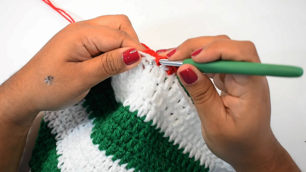 As the pattern grows in length, decrease stitches at regular intervals to shape the signature tapered point. Based on the tutorial’s tips, adding stripes in contrasting holiday colors like red, green, or white can give the hat a more festive flair.