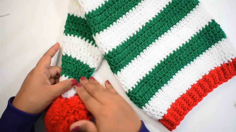 Once the main structure is complete, accentuate the design with a pom-pom, tassel, or other decorations suggested in the tutorial. Be sure to check your progress and maintain consistent tension throughout to achieve the correct fit and shape.