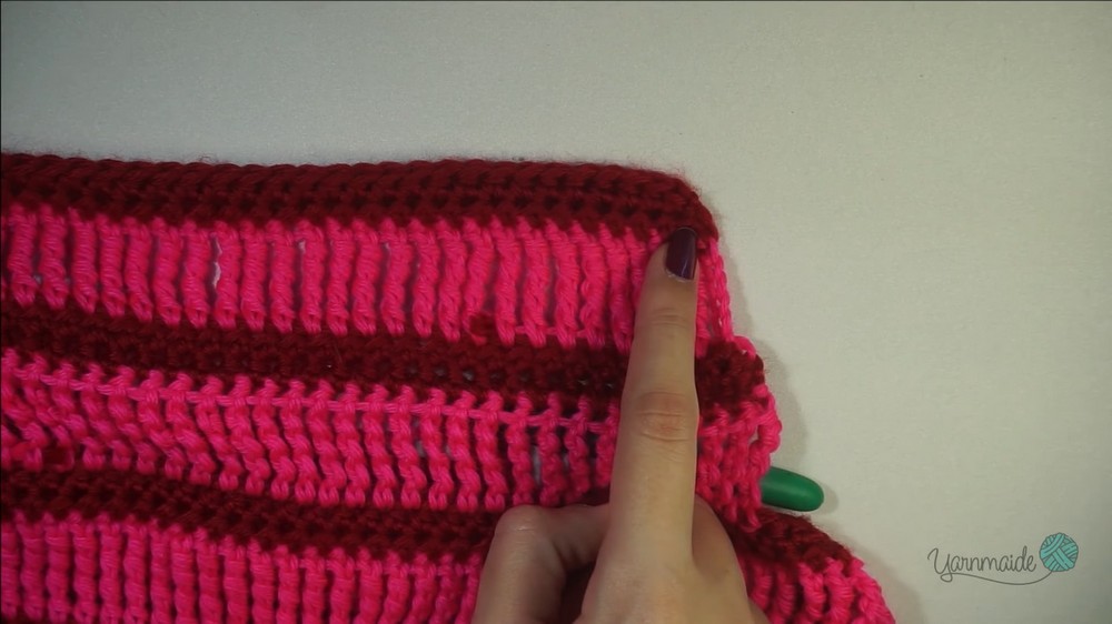 - Repeat for the entire row. Change colors again at the end of the row and begin another round of half double crochets.