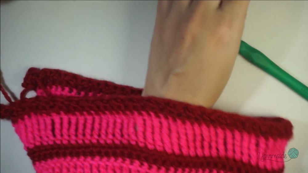 - At the end of the second row, change to a new yarn color before finishing the last half double crochet. Secure the change with a knot and continue.