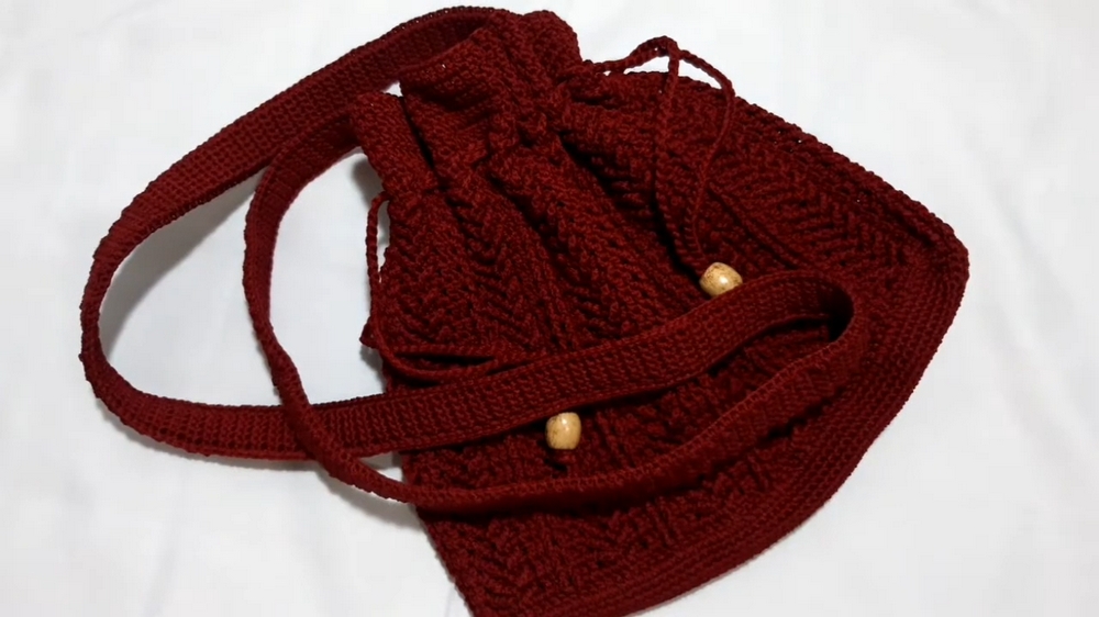 - Add a drawstring rope made of chain stitches and insert it through eyelets in the pattern.