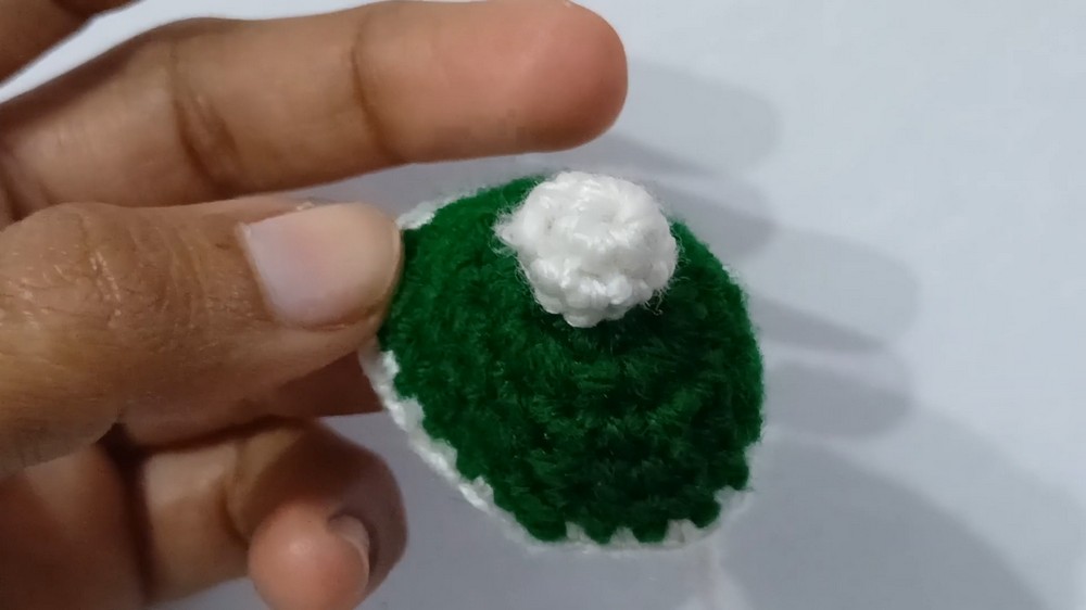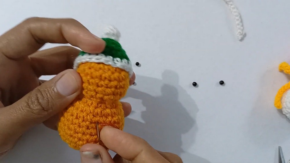 Midway through the process, attention shifts to adding personality and charm. A vibrant scarf crocheted in a contrasting color gracefully wraps around the neck, while a tiny hat with a pom-pom sits jauntily atop the head.