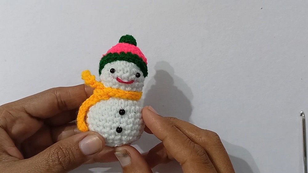 - Decorative Accessories: Includes a crochet scarf, pom-pom for the hat, and black beads or stitched thread for the eyes and smile, adding character.