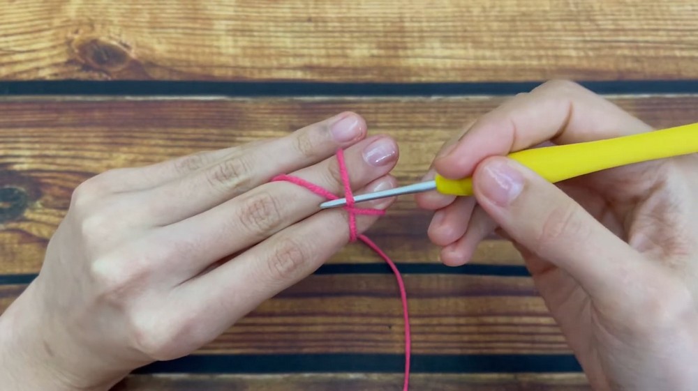 - Begin with a MR. (Wrap yarn around two fingers, cross, and insert hook under front loop. Draw up a loop, ch 1 to secure.)