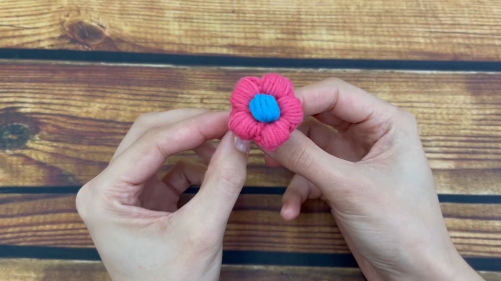 - Thread ends of flower center with tapestry needle and sew into the middle of flower firmly, pulling to back. Knot and trim excess.
