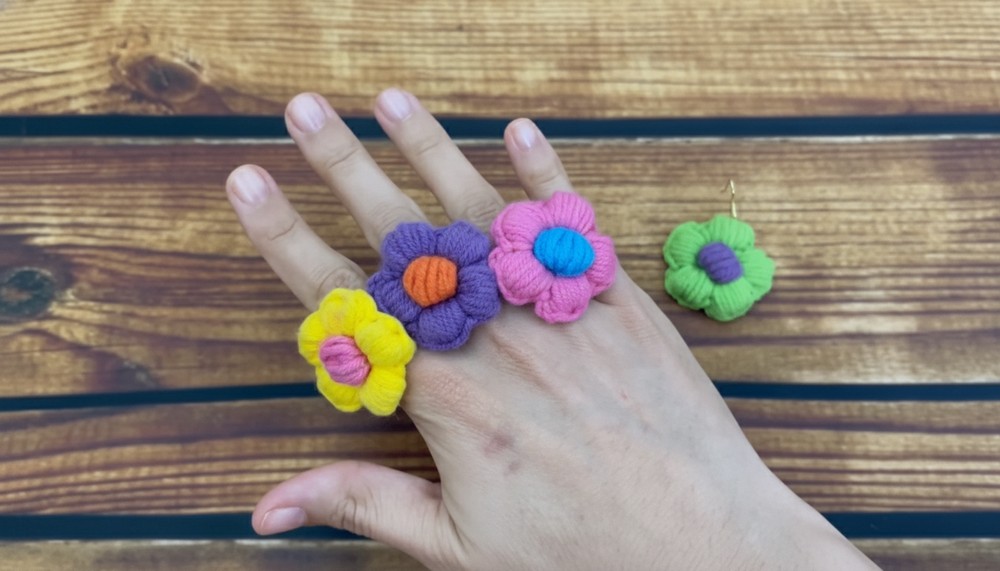 You now have a fun, fluffy, and puffy crochet flower ring! Experiment with colors and sizing for a variety of accessories. These flowers are perfect as rings, earrings, bag charms, appliqués for garments, or even as party favors.