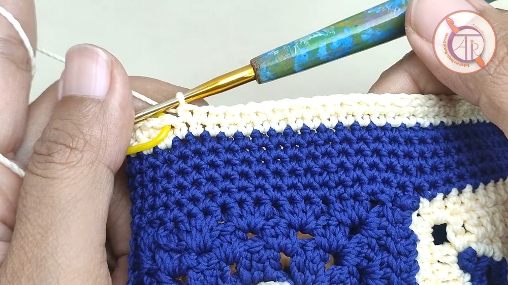 The tutorial emphasizes maintaining consistent tension and size when making the squares, ensuring they fit together seamlessly. Once you’ve made the required number of squares, you will connect them to form the main body of the bag.