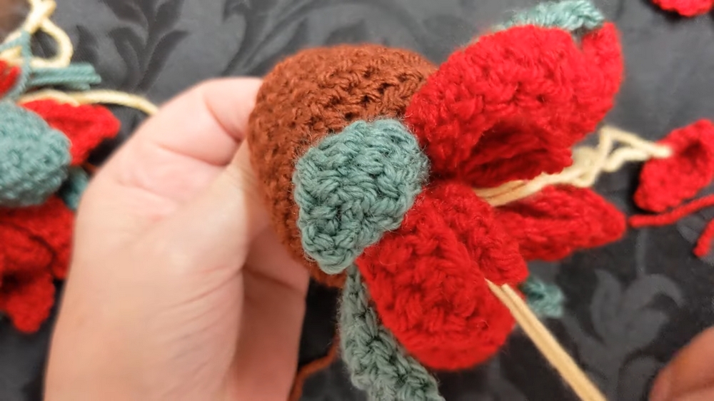 - Add the green leaves around the red section. Position them in the gaps between the red leaves, using a similar knot-tightening technique.