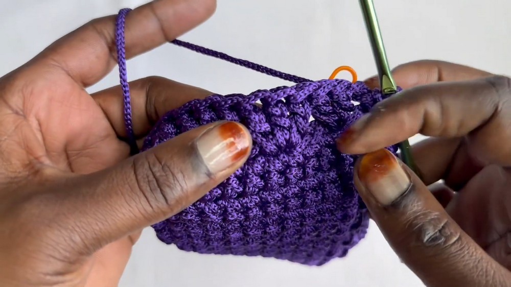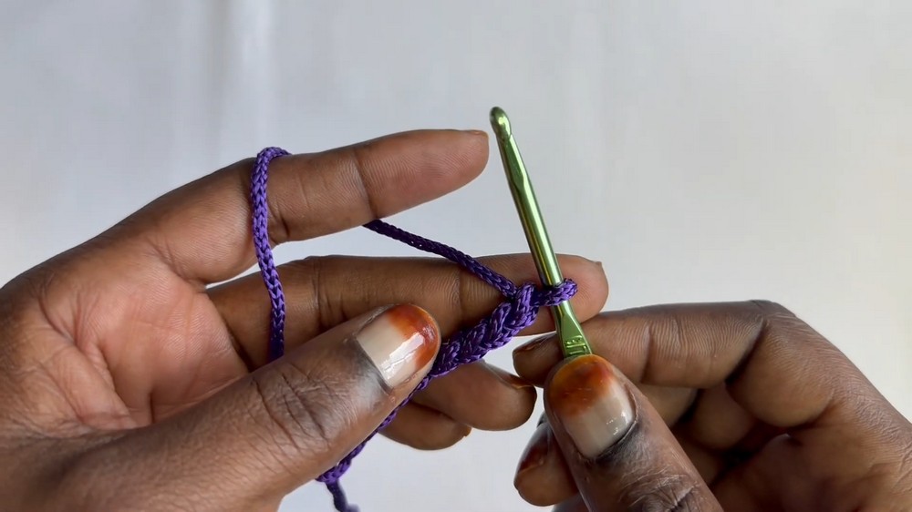 - Using your first yarn color (e.g., purple), chain 10 (or any multiple of 3 + 1 for larger or smaller bases).