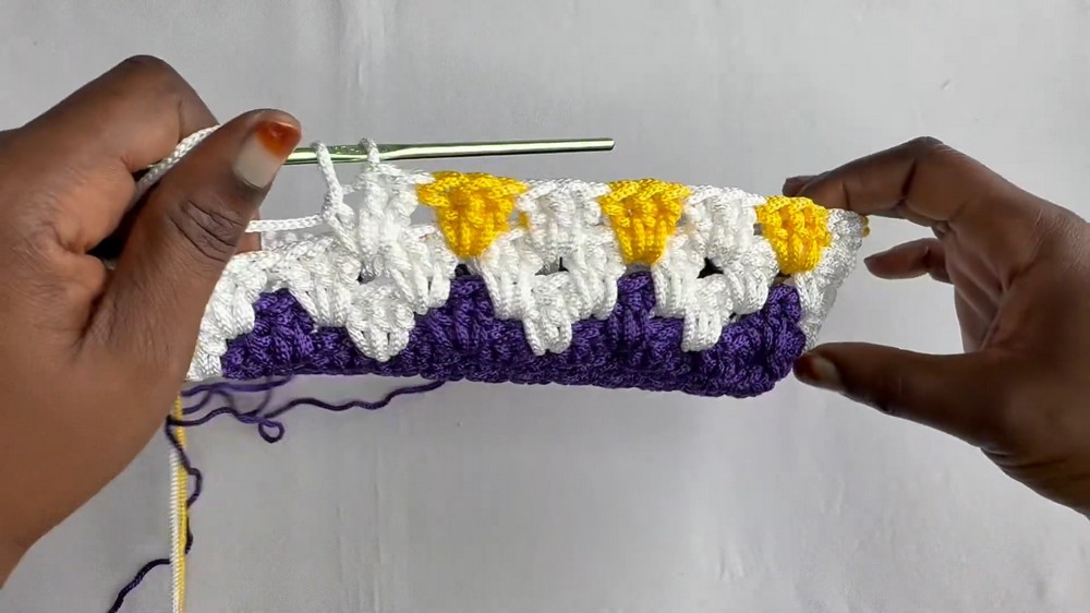- Alternate yarn colors after each row using the cluster stitch.
