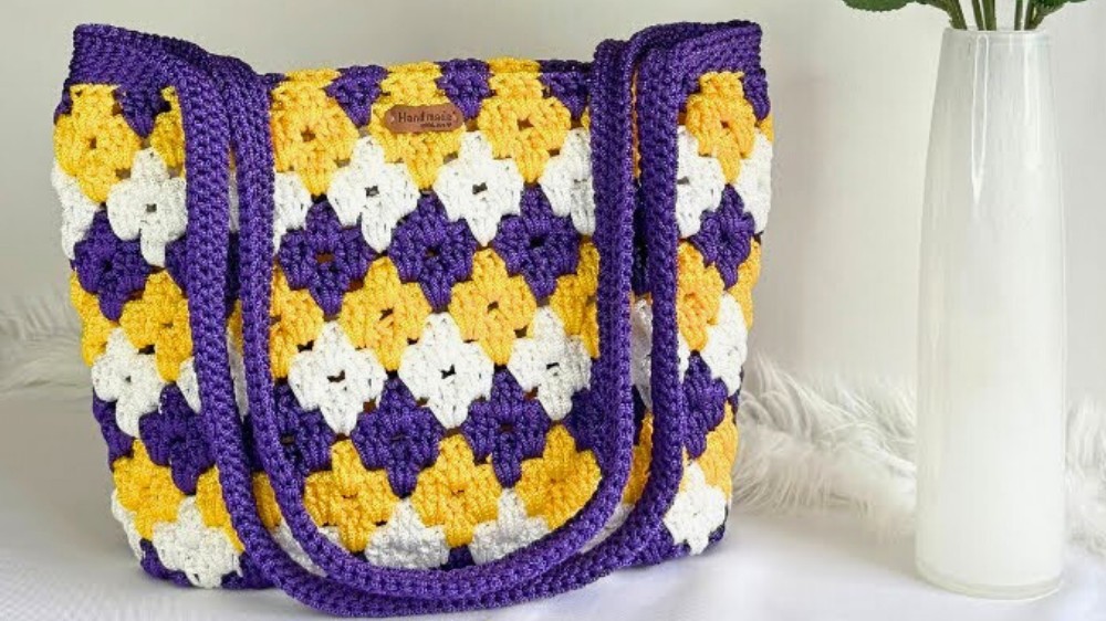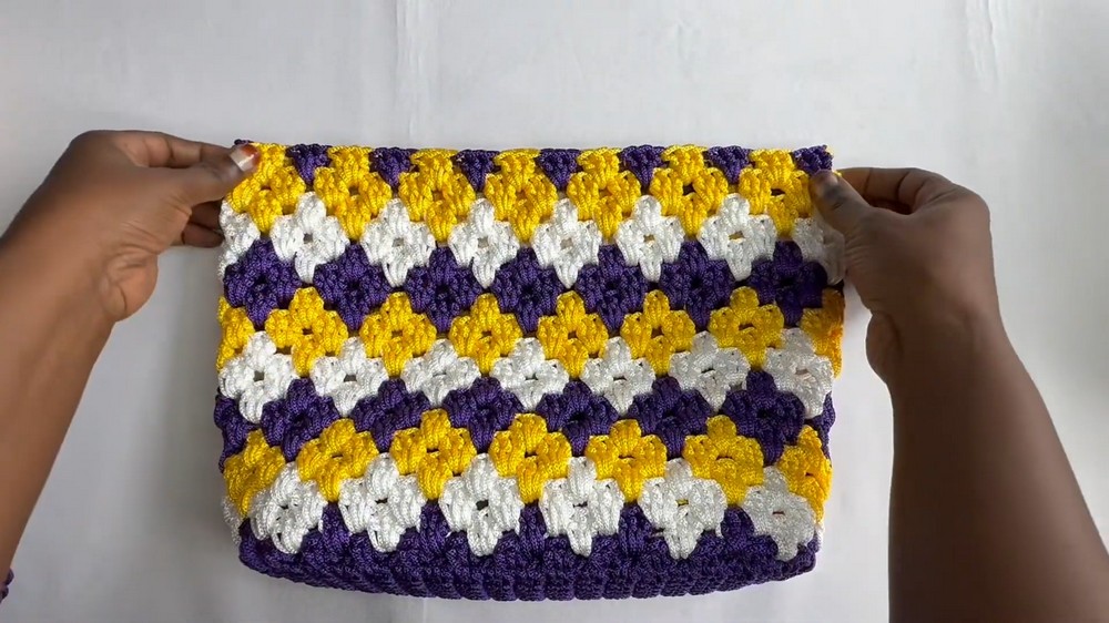 - Colorful Granny-Style Clusters: The bag’s body features alternating colorful double-crochet clusters, creating a unique granny pattern.