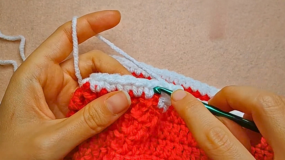 - Cut the red yarn and secure the white yarn by pulling it through the loop of the red yarn. Tighten securely.