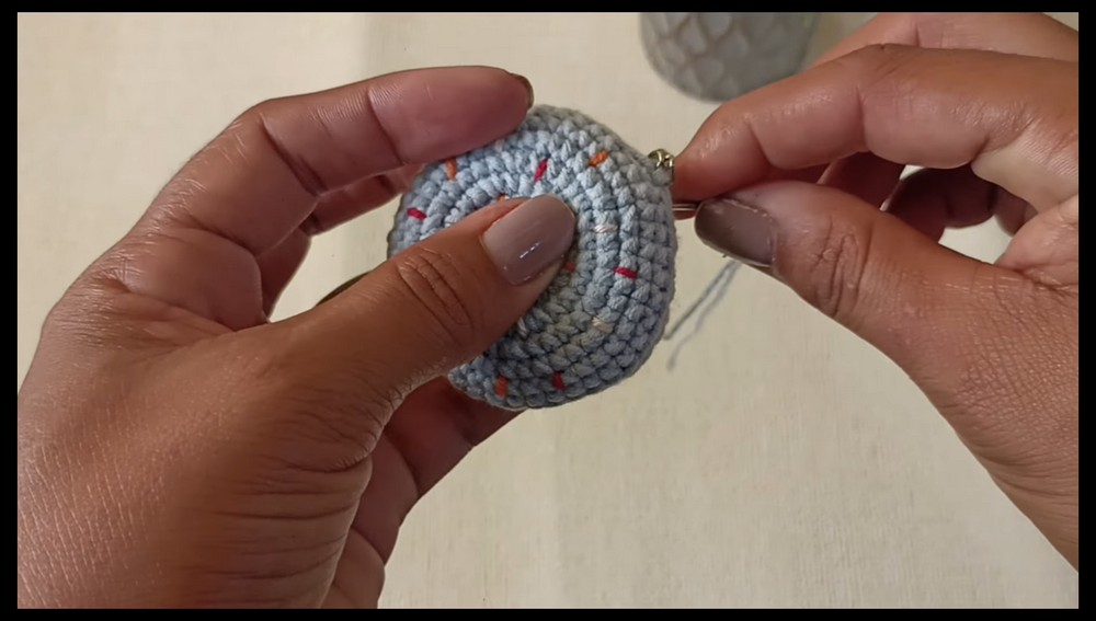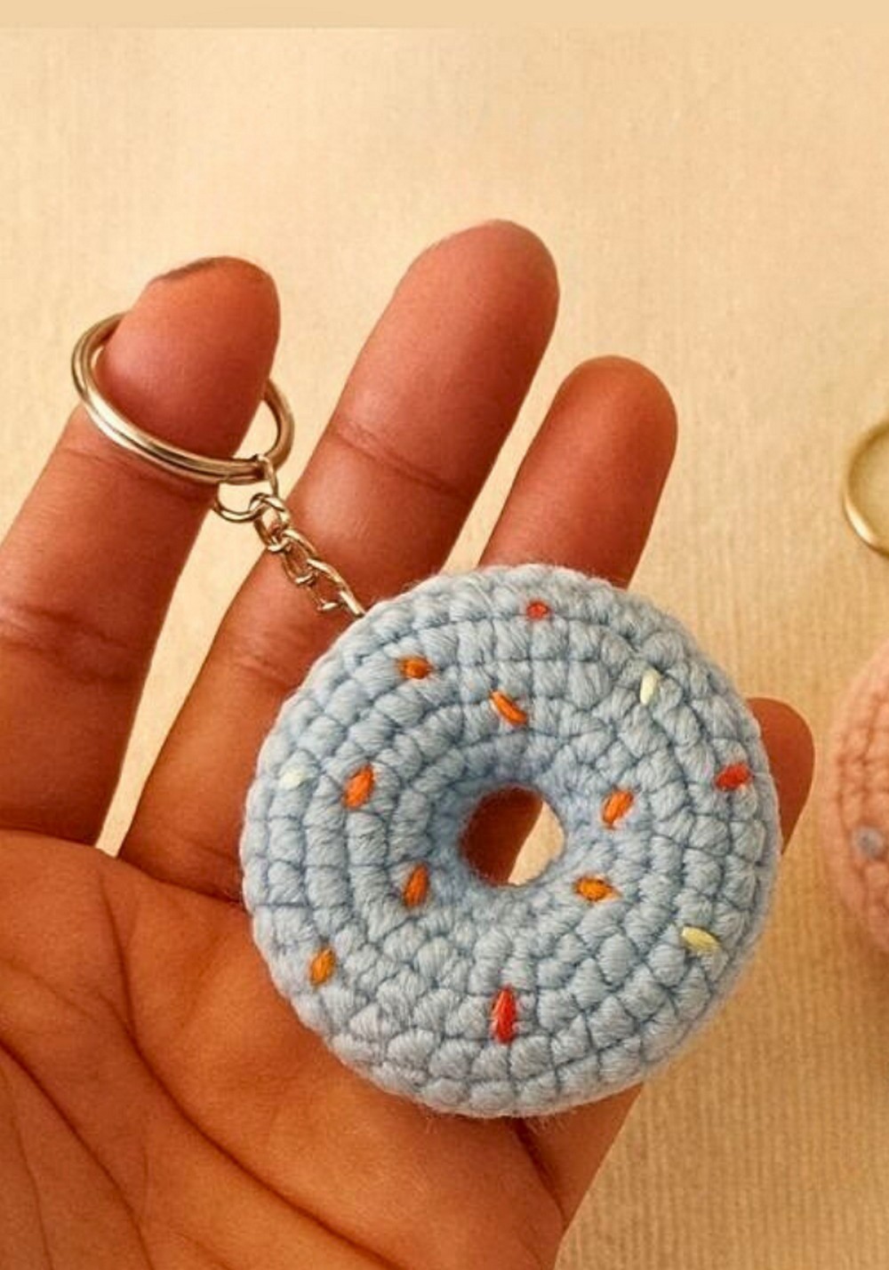 To attach the keychain hardware, a tapestry needle is used to connect the donut securely to a keyring or lobster clasp. Tight stitching ensures durability during everyday use.