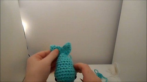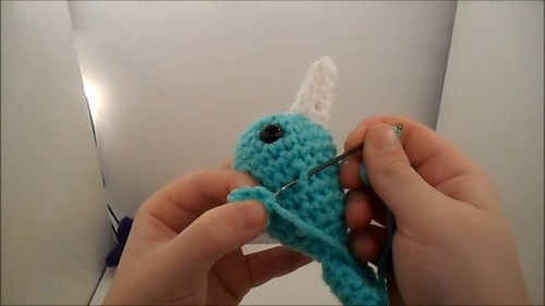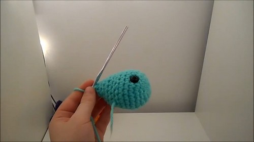 - Using the long tail from your first side fin, sew the fin to one side of the body, approximately 2 rounds below the safety eyes.