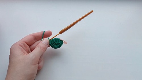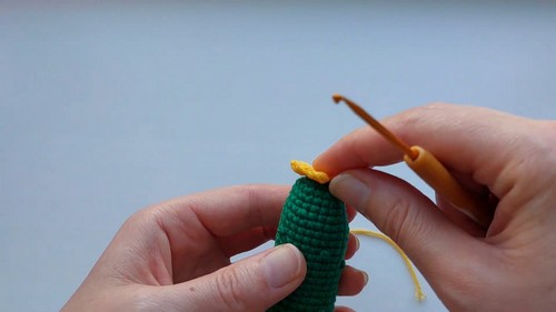 - Attach green yarn to the top of the cucumber, ch 5, turn.