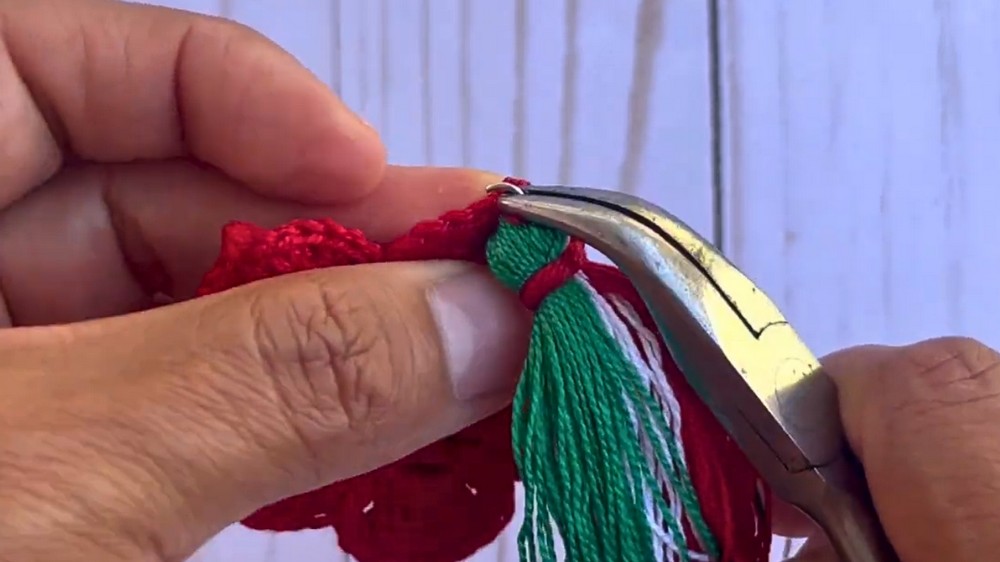 - Add a small ring by threading it through 2–3 tassel strands. Attach the tassel to the flower’s petal tip using jewelry pliers.