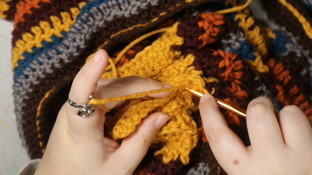 - Repeat Rows 2–3 around sleeve opening, slip stitching into sleeve edge each time, until cuff is complete.