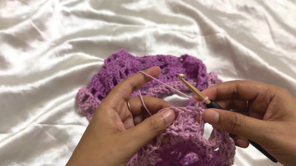 - Continue: Chain 2, skip one, then place a DC. Repeat the pattern (chain 2, skip one stitch, DC) for the entire row.