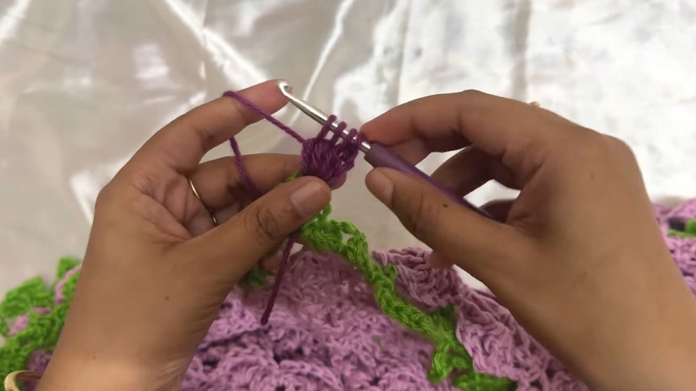 - Use green yarn to create chains (leaves and petal-holding spaces). Chain and skip stitches, making loops for the floral base.