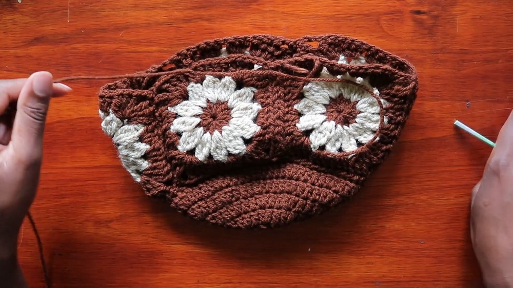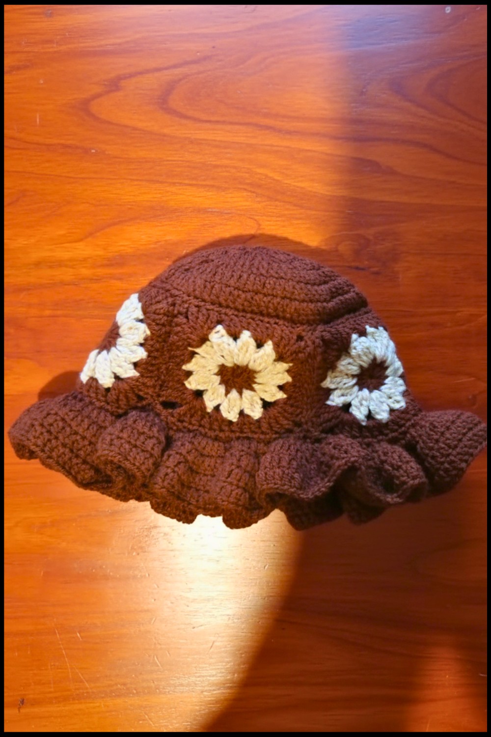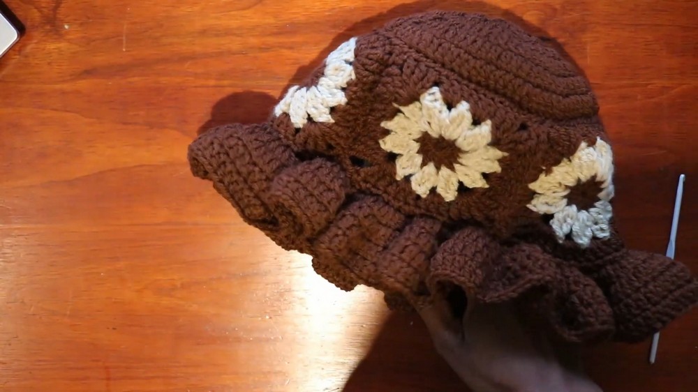 - This project consists of five flower squares, a circular top, and a ruffled hdc brim.