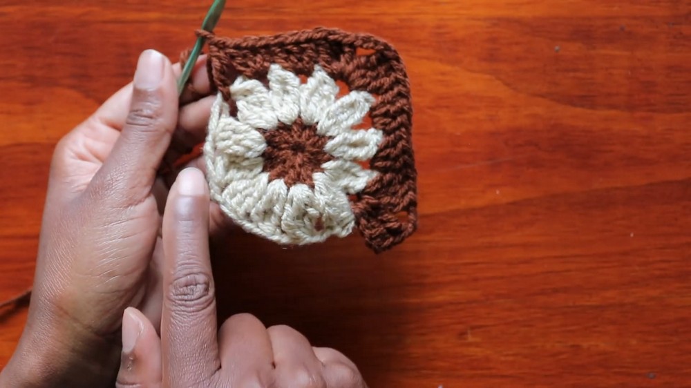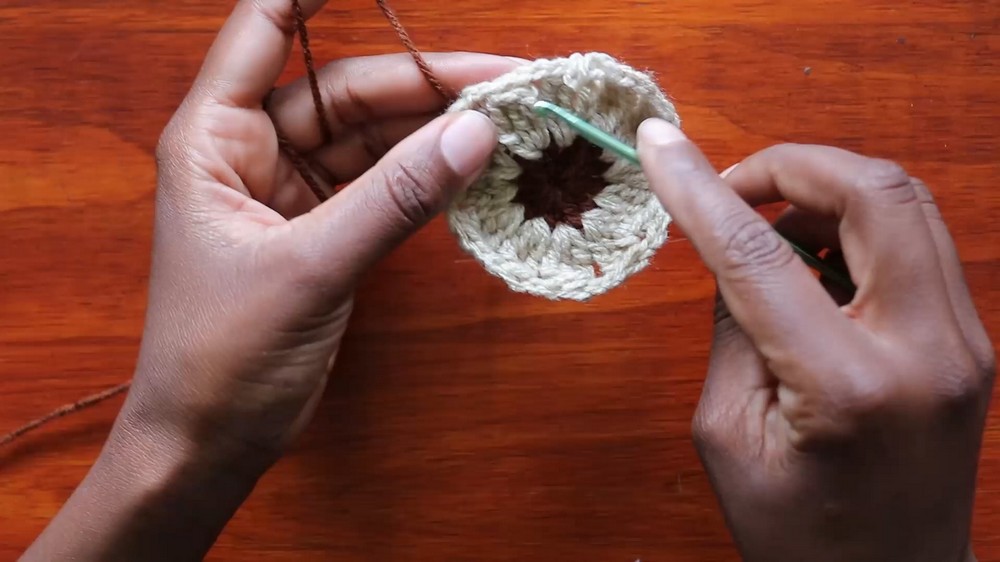 - Work 7 rounds total, or until the flat circle matches the width of your joined squares’ ring. (Approx. 6–6.5 inches/16–17 cm in diameter.)