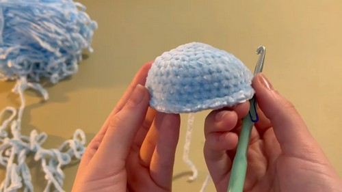 - 1 sc in the first stitch, increase in the next stitch, repeat around. (7 increases -> 21 stitches)