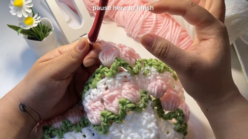 - The tulip bag features a delightful combination of green, pink, and white yarns, creating a vibrant and eye-catching finished product.