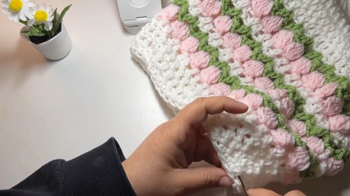 - Double crochet into the space before the tulip and then into the tulip stitch itself.