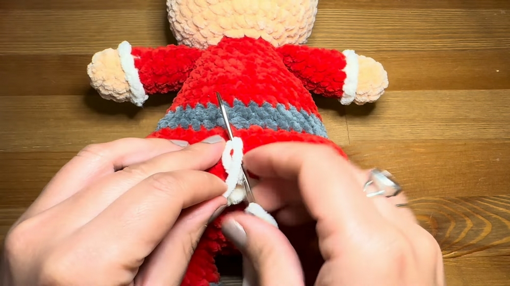 - Final Steps: Use your hook to flatten and crochet across the arm to seal it. Add white yarn to create detailed cuffs, working into the front loops of the cream base.
