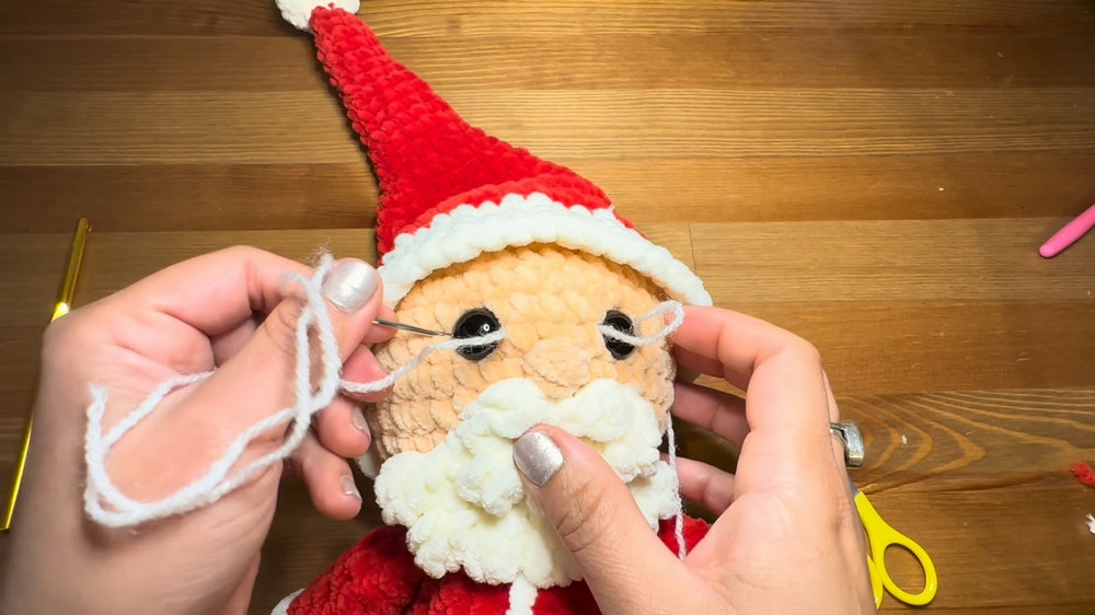 - Beard: Create a fluffy beard using puff stitches and single crochet rows. Attach it to the lower face area using white yarn.
