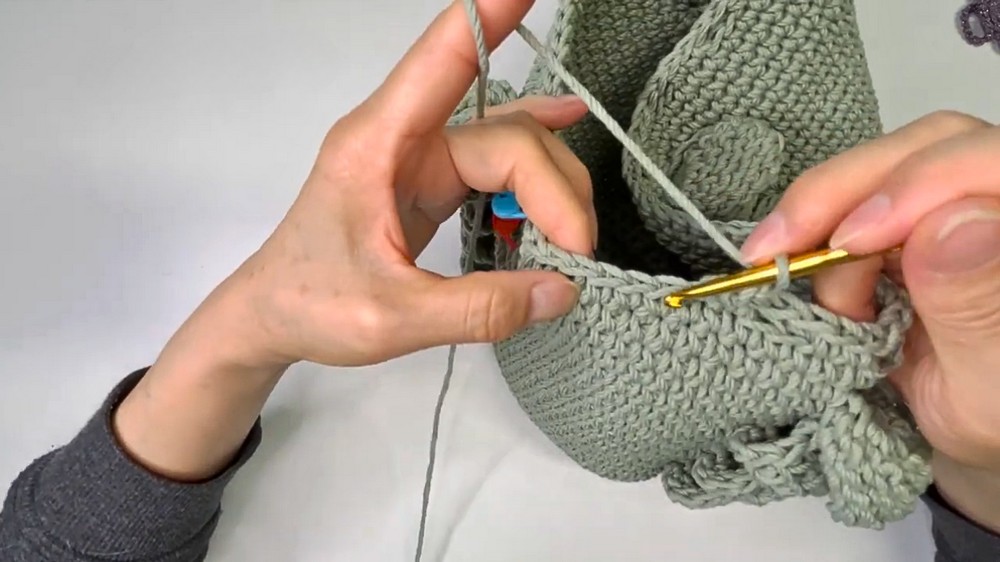 The pattern starts with a simple foundation chain, setting the size of the bag. Rows of single crochet stitches are added to build the base and body, providing support and structure to hold its shape.