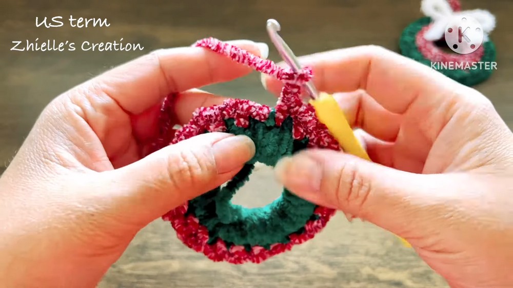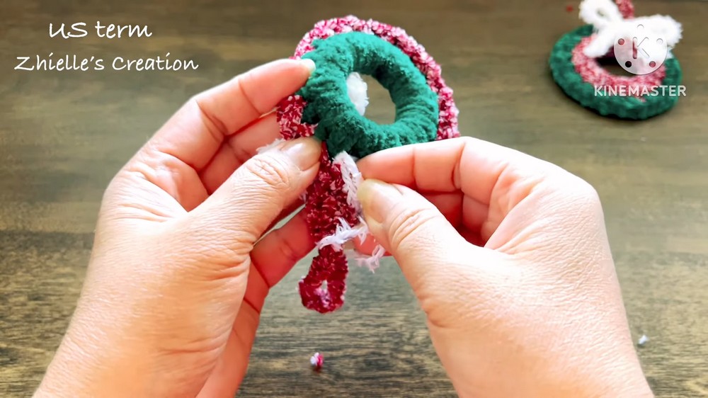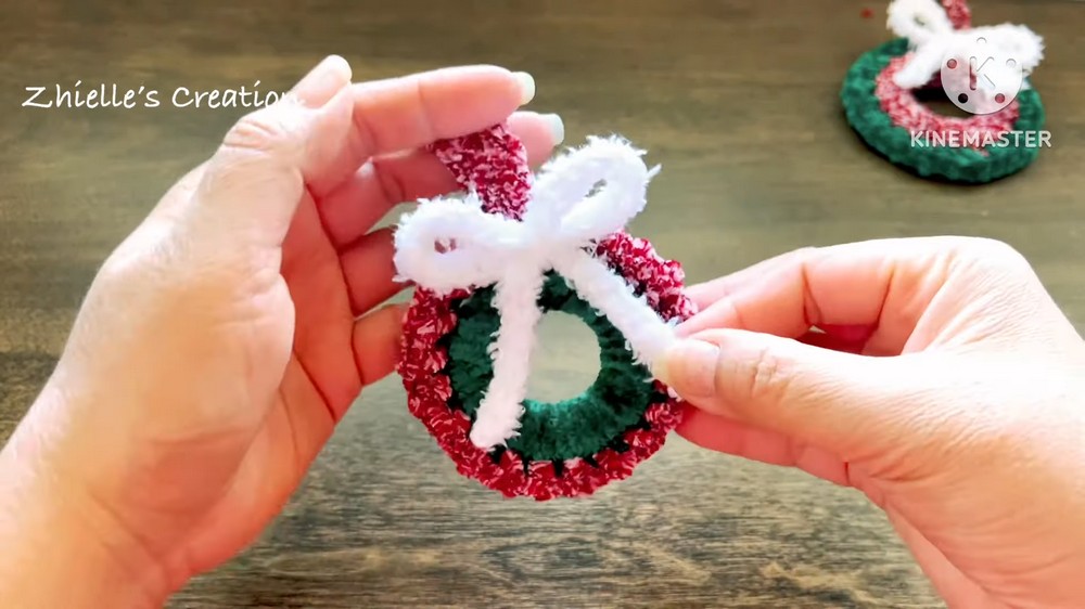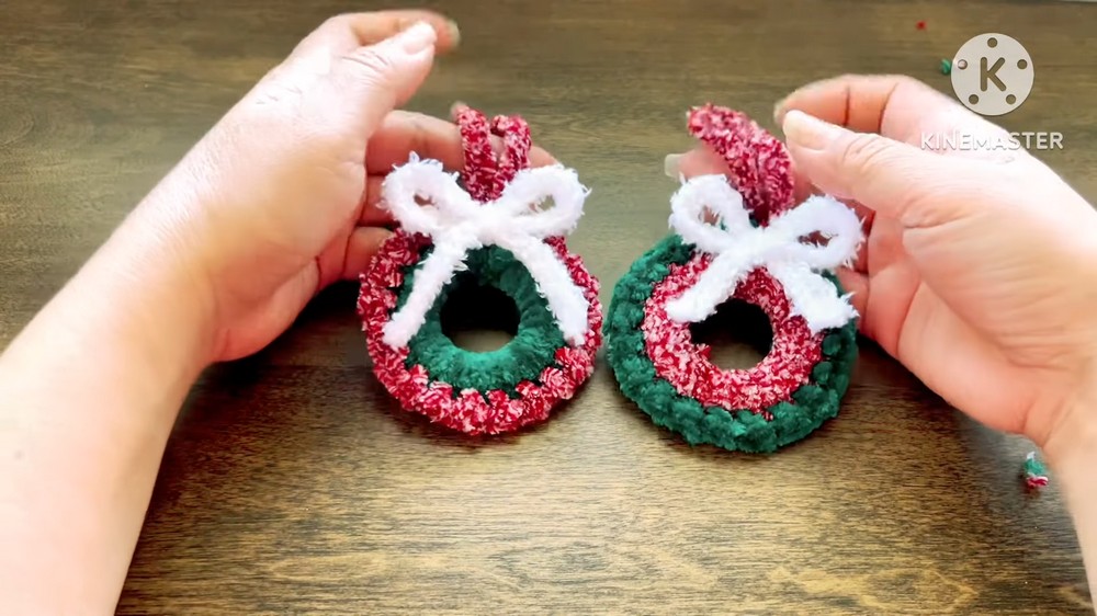 - Sew the bow onto the lower center of the green wreath, ensuring it is securely attached.