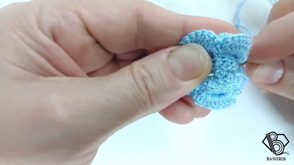 - Into each hollow spot: Make 1 single crochet, 9 double crochets, and then 1 single crochet.