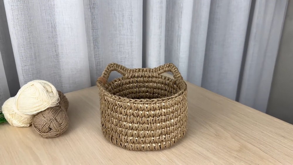 The walls are then built upwards without increases, with stitches forming tightly and consistently to ensure a firm structure. To complete the basket, charming kitten ears are added.