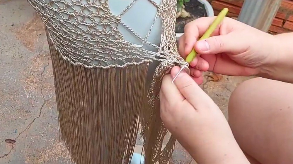 Once the main body is complete, add fringe by cutting equal lengths of yarn and attaching them along the hemline using a slipknot method.
