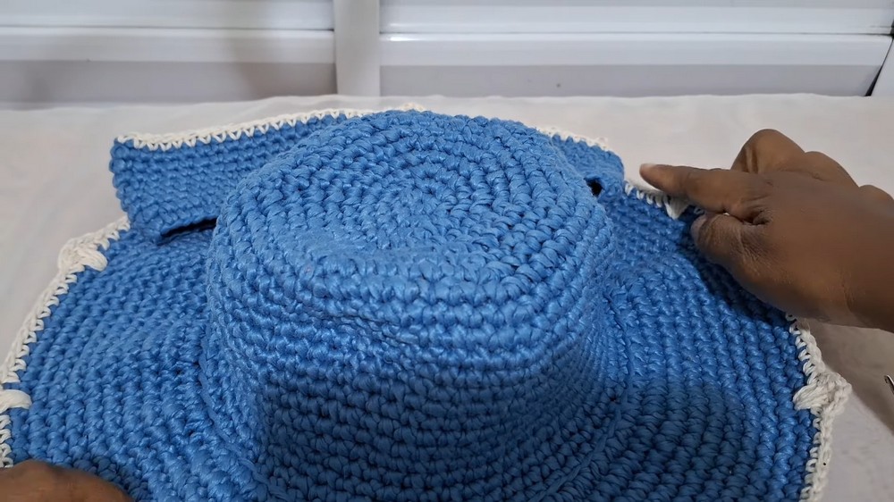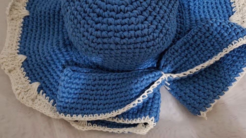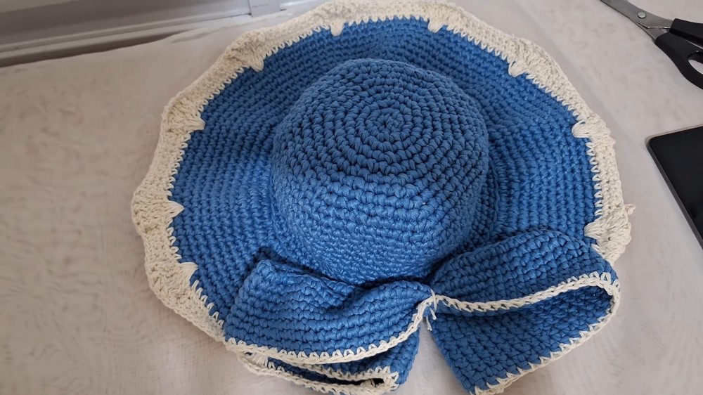 After reaching the required diameter, the stitches even out for several rounds to achieve the desired depth before finishing off with a clean edging. To make the bow, follow a simple rectangular panel design created with consistent stitches. Fold the panel and cinch it in the center to form the bow, which can then be securely attached to the hat.