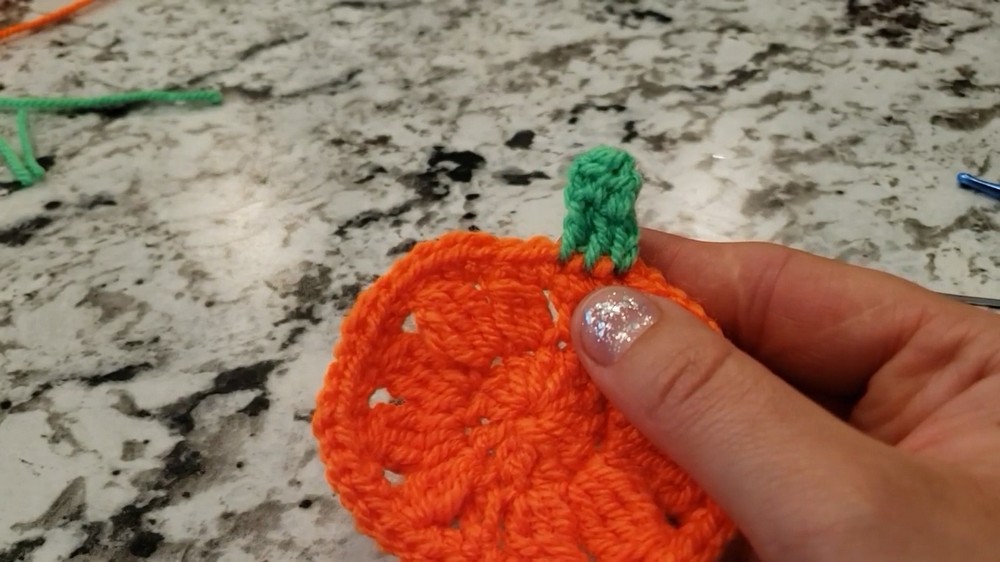 - Start by joining the green yarn to the pumpkin and chain two.