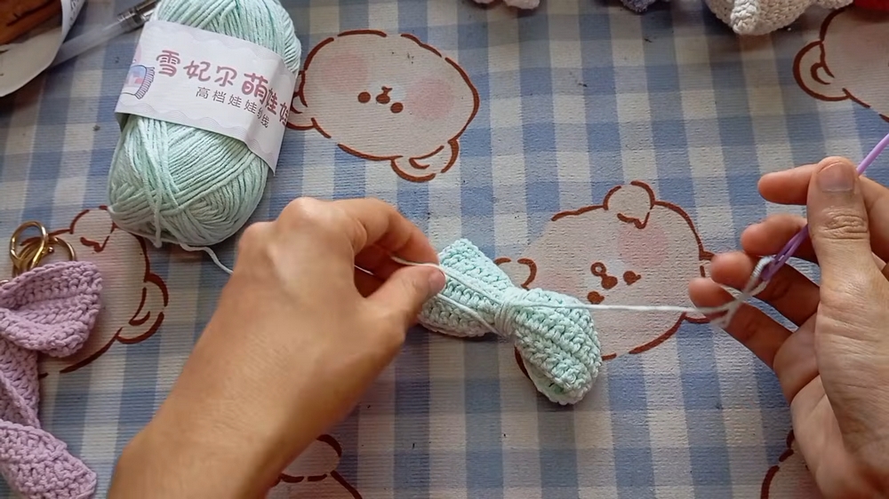 - Shape the Bow: Pinch the middle of the assembled piece to shape the bow and tightly wrap the long tail around its center (approximately 10 times). Once satisfied with the shape, secure and weave in the yarn tail.