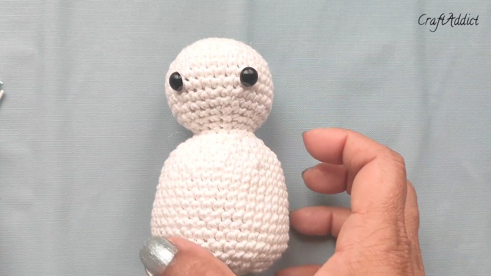- Attach safety eyes between Rows 8 and 9, spacing them 5-6 stitches apart.