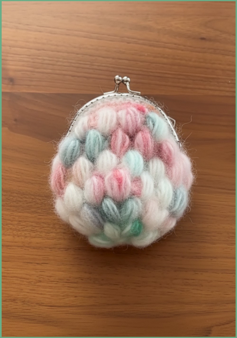 Your sturdy, textured coin purse is now complete! Experiment with different fibers and colors for a unique effect. The honeycomb yarn adds extra thickness and warmth, making your purse robust and cute. Adjust the pattern to work with other metal frames and yarn types.