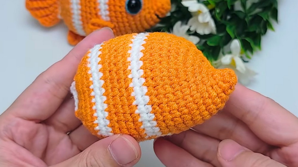 It recommends paying close attention to the gradual stitch increases and decreases to ensure the clownfish’s body remains round and uniform. Keep your thread changes smooth for clean color separation and adjust the stuffing evenly to avoid lumps.