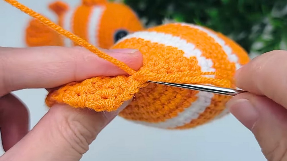 - Maintain the pattern by creating 36 short stitches per round. During these rounds, switch between orange and white yarn to add the clownfish’s stripes. Use short stitch changes for smooth transitions between colors.