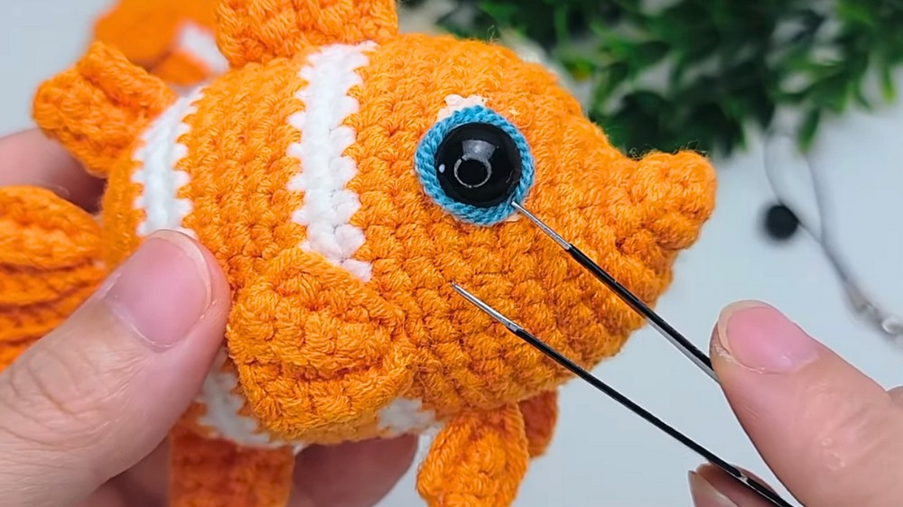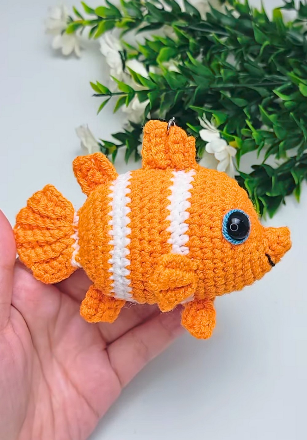 Once completed, sew all the fins onto the clownfish, body securely to ensure they stay firmly attached. Additionally, add eye buttons at the end to give the clownfish a lively and realistic look.