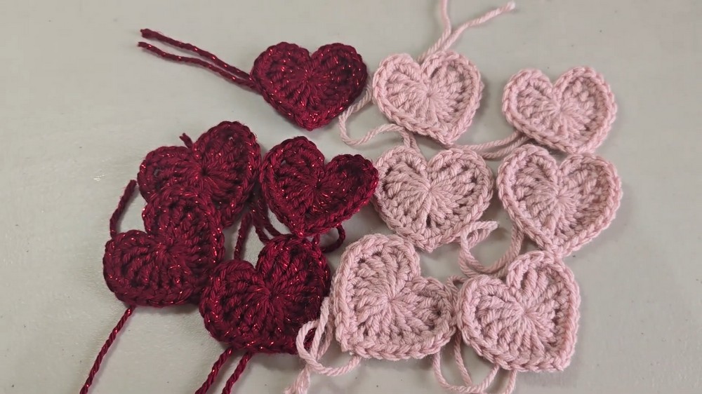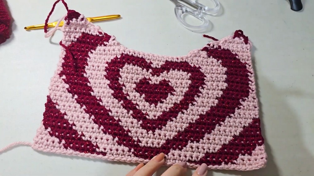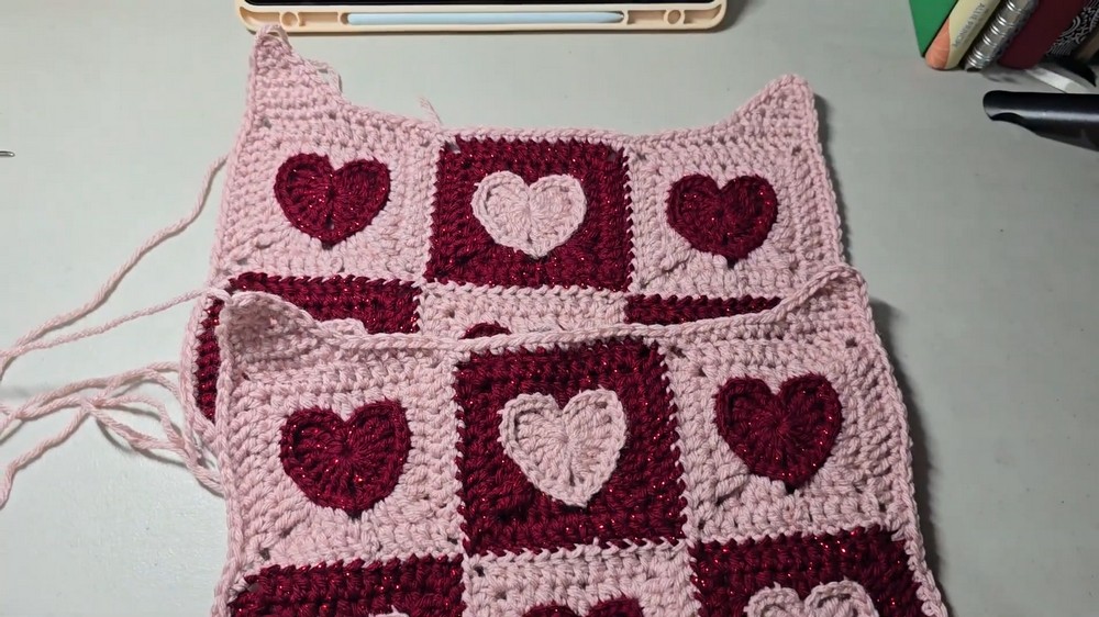 - Each panel: Single crochet following heart graph (~40 rows; adjust for desired size, sample is about 8×8 inches).
