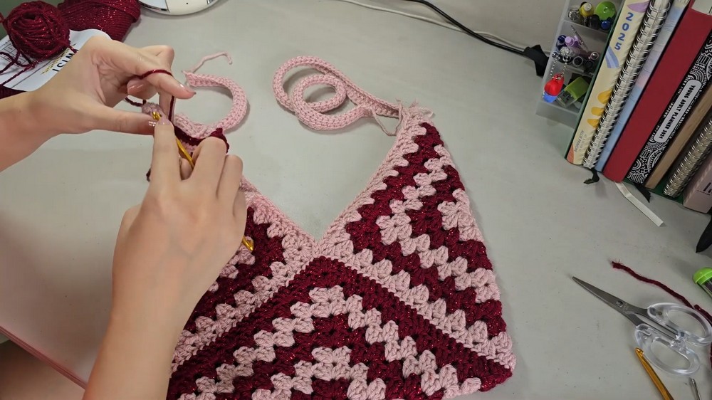 - Add Second Panel: Attach second panel in the same way on the other side of the strap with sl st or by sewing.